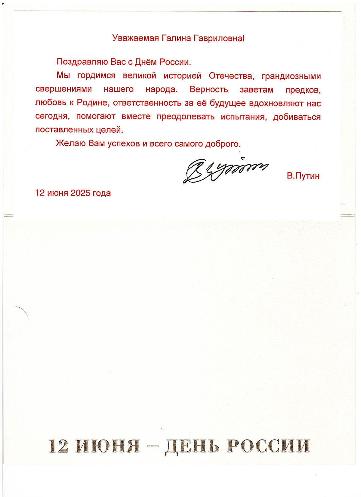 «Мы гордимся великой историей Отечества, грандиозными свершениями нашего народа. Верность заветам предков, любовь к Родине, ответственность за её будущее вдохновляют нас сегодня, помогают вместе преодолевать испытания, добиваться поставленных целей», — говорится в поздравительном послании, адресованном Галине Гавриловне Ершовой.