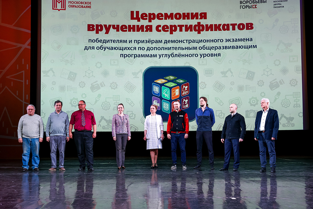 15 мая 2025 г. в Московском дворце пионеров прошла торжественная церемония вручения сертификатов участникам демонстрационного экзамена для обучающихся по дополнительным общеразвивающим программам углублённого уровня, которые получили оценку 50 и более процентов от максимально возможного количества баллов за выполненное задание.