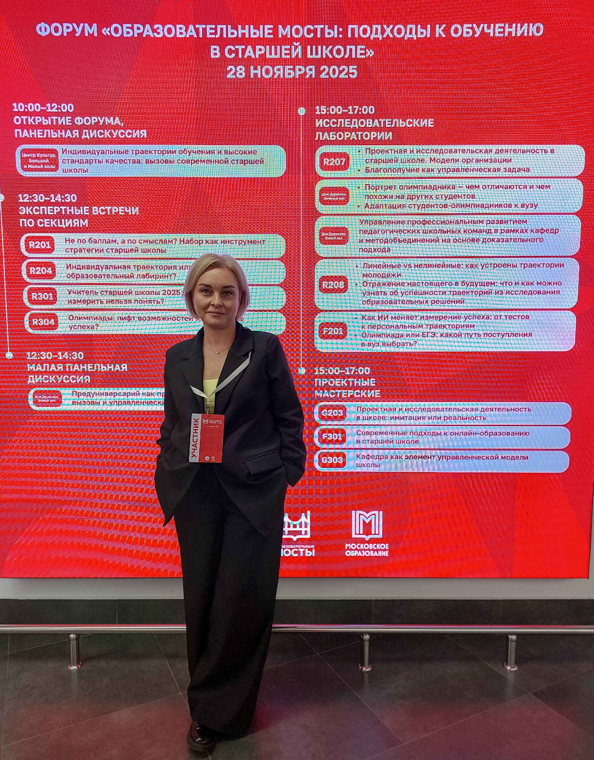 28–29 ноября в НИУ ВШЭ прошёл форум «Образовательные мосты: подходы к обучению в старшей школе», организованный Департаментом образования и науки города Москвы совместно с НИУ ВШЭ. На форуме присутствовали представители различных образовательных организаций Москвы: школ, предуниверсариев, вузов, организаций СПО. От РГГУ в мероприятии приняли участие директор Предуниверсария РГГУ Ирина Владимировна Воробьева и педагог‑организатор Мария Николаевна Филиппова.