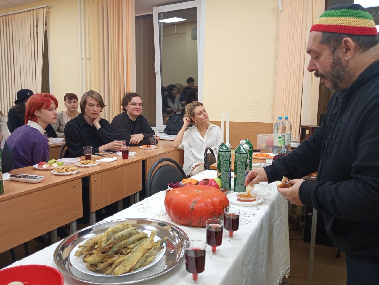 Студенты, пришедшие на праздник в ЦИР, послушали рассказ о цикле осенних праздников в иудаизме: Рош га-Шана, Йом-Кипур, Суккот и Симхат Тора – все эти праздники медленно, в течение месяца, перетекают один в другой, знаменуя начало нового жизненного и земледельческого цикла, предвещая сезон дождей и новый урожай.