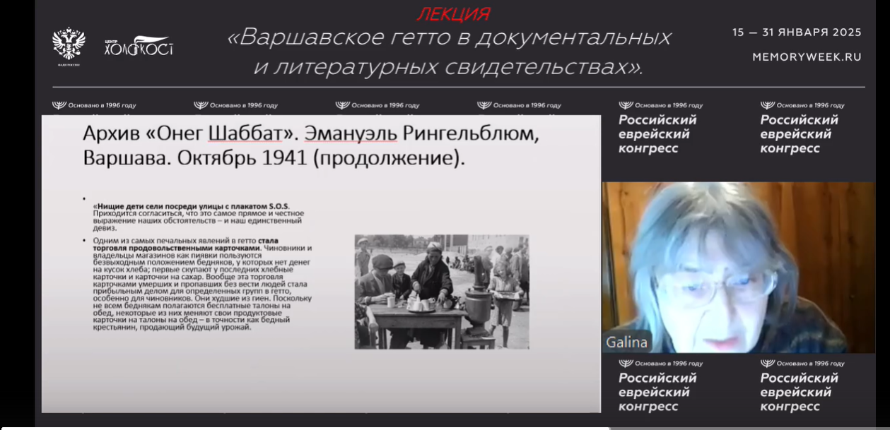 Галина Элиасберг прочитала лекцию «Варшавское гетто в документальных и литературных свидетельствах». Вопреки тяжелейшим условиям, в Варшавском гетто продолжалась культурная жизнь, о чем свидетельствуют материалы из архива Эммануэля Рингельблюма, «Дневник» Януша Корчака, поэзия Владислава Шлегеля и Рохл Ауэрбах. Особое место в корпусе литературных текстов занимает поэма Ицхака Каценельсона «Песнь об убиенном еврейском народе» (октябрь 1943 – январь 1944), отразившая хронологию трагических событий и героику восстания (19 апреля – 16 мая 1943). Продолжая традиции библейских и средневековых плачей-кинот, поэт передает сложную гамму личных переживаний и духовных исканий своего поколения.