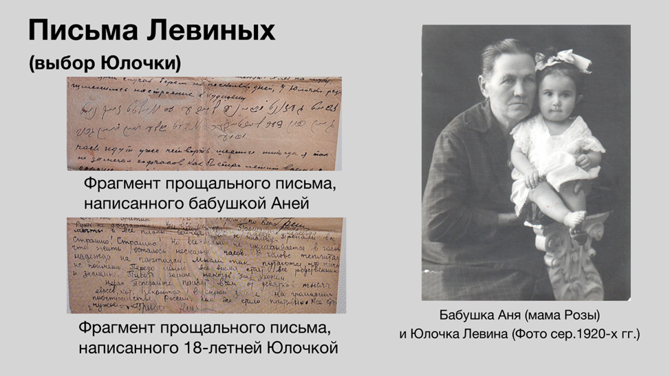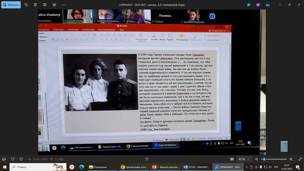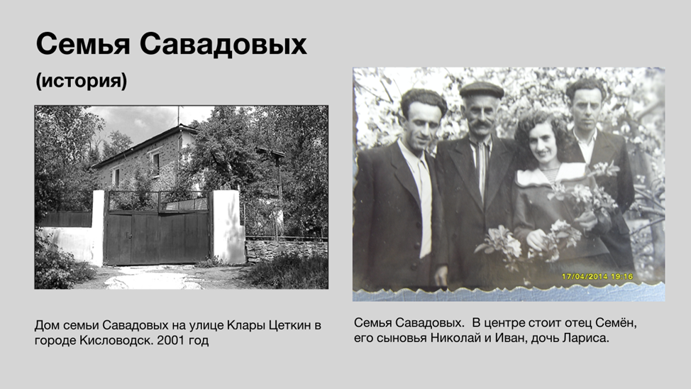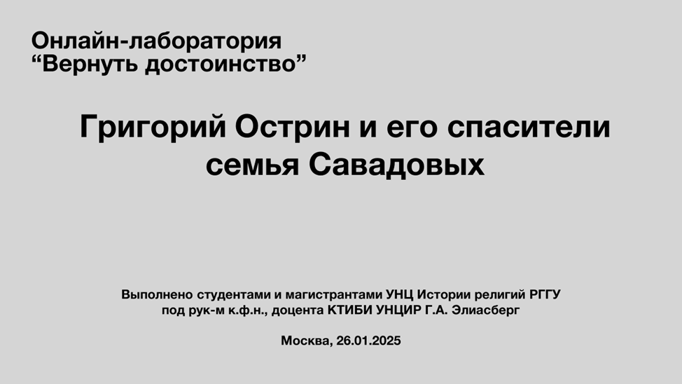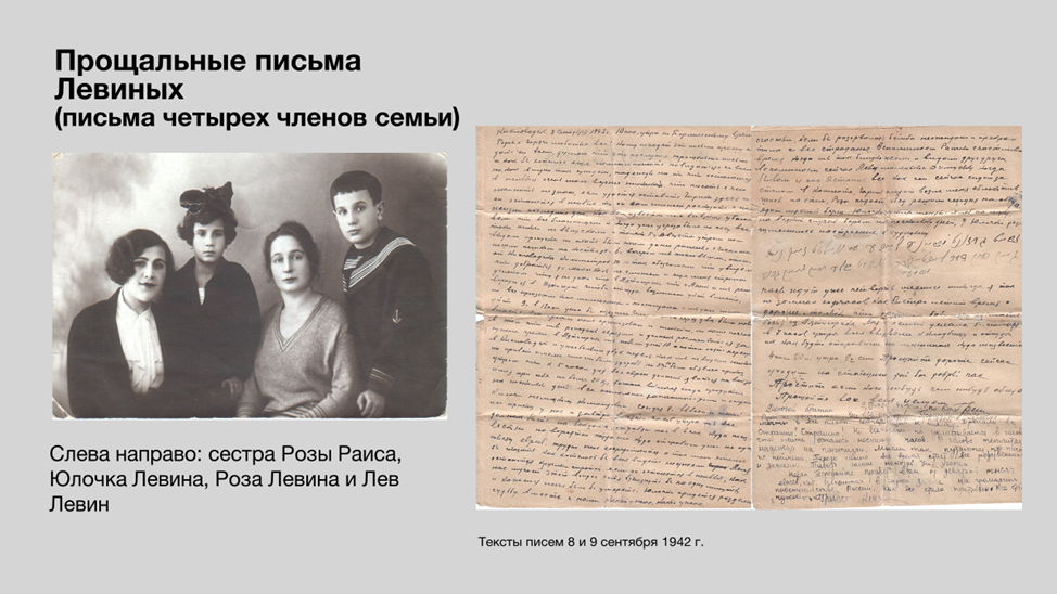 Уникальными документами стали прощальные письма, написанные 8 и 9 сентября 1942 г. взрослыми членами семьи Левиных незадолго до их гибели, где сообщалось о том, что они оставляют ребенка в семье Савадовых. В 2022 г. письма были переданы в архив НПЦ их родственницей Анной Львовной Скобликовой. В ходе работы участники группы изучили эти документы, а также материалы, отражающие историю Ставропольского края во время немецкой оккупации, провели онлайн встречу с А.Л. Скобликовой, рассказавшей об обнаружении писем и судьбе Гарика – Григория Александровича Острина (1930–2016), актера театра «Современник». Результаты исследования были представлены на итоговой онлайн презентации «Григорий Острин и его спасители семья Савадовых». Для участников группы совместная работа стала полезным опытом и позволила лучше понять трагические обстоятельства, с которыми сталкивались люди в годы войны, оценить нравственный выбор тех, кто рисковал жизнью ради спасения ребенка.