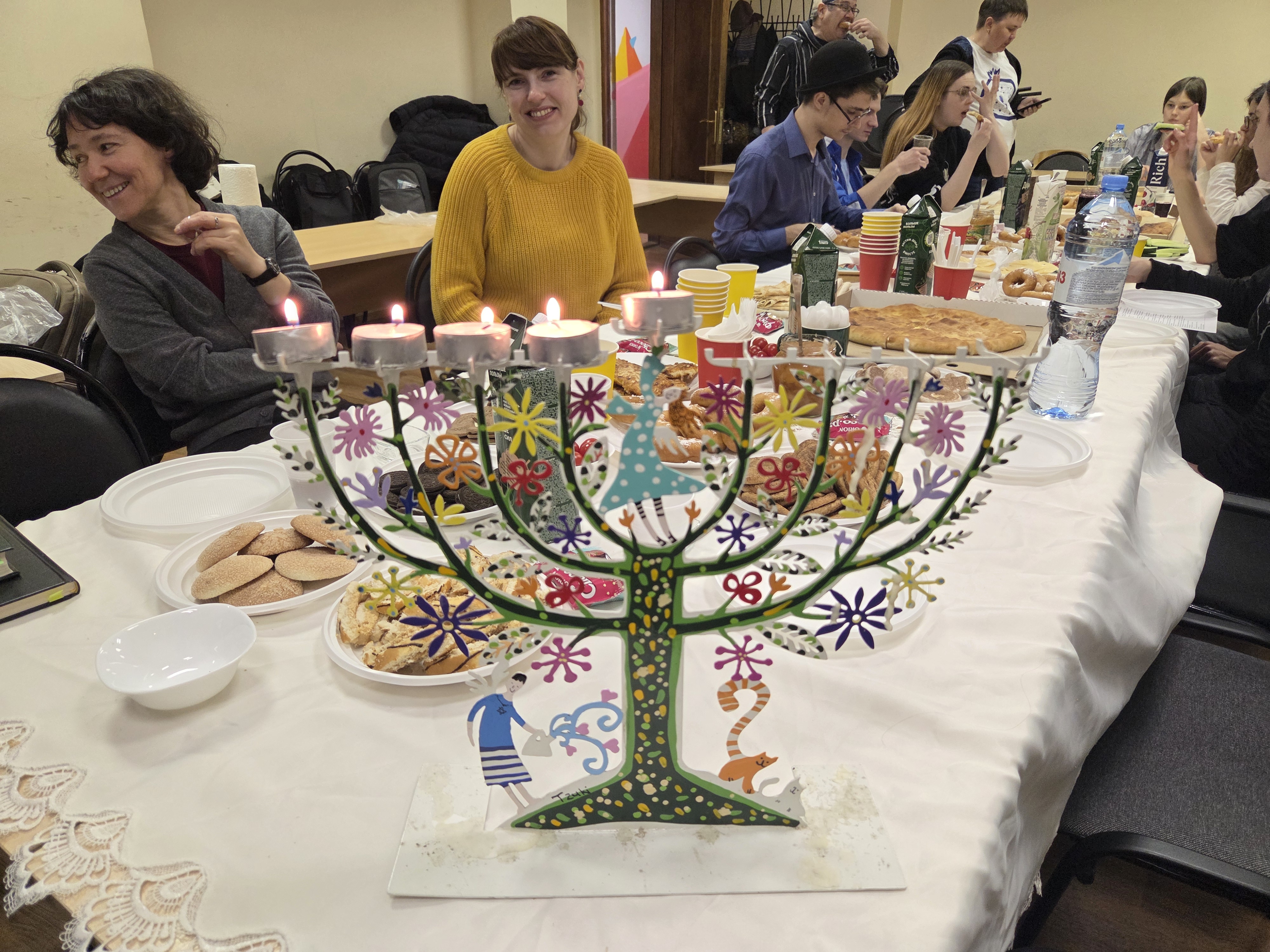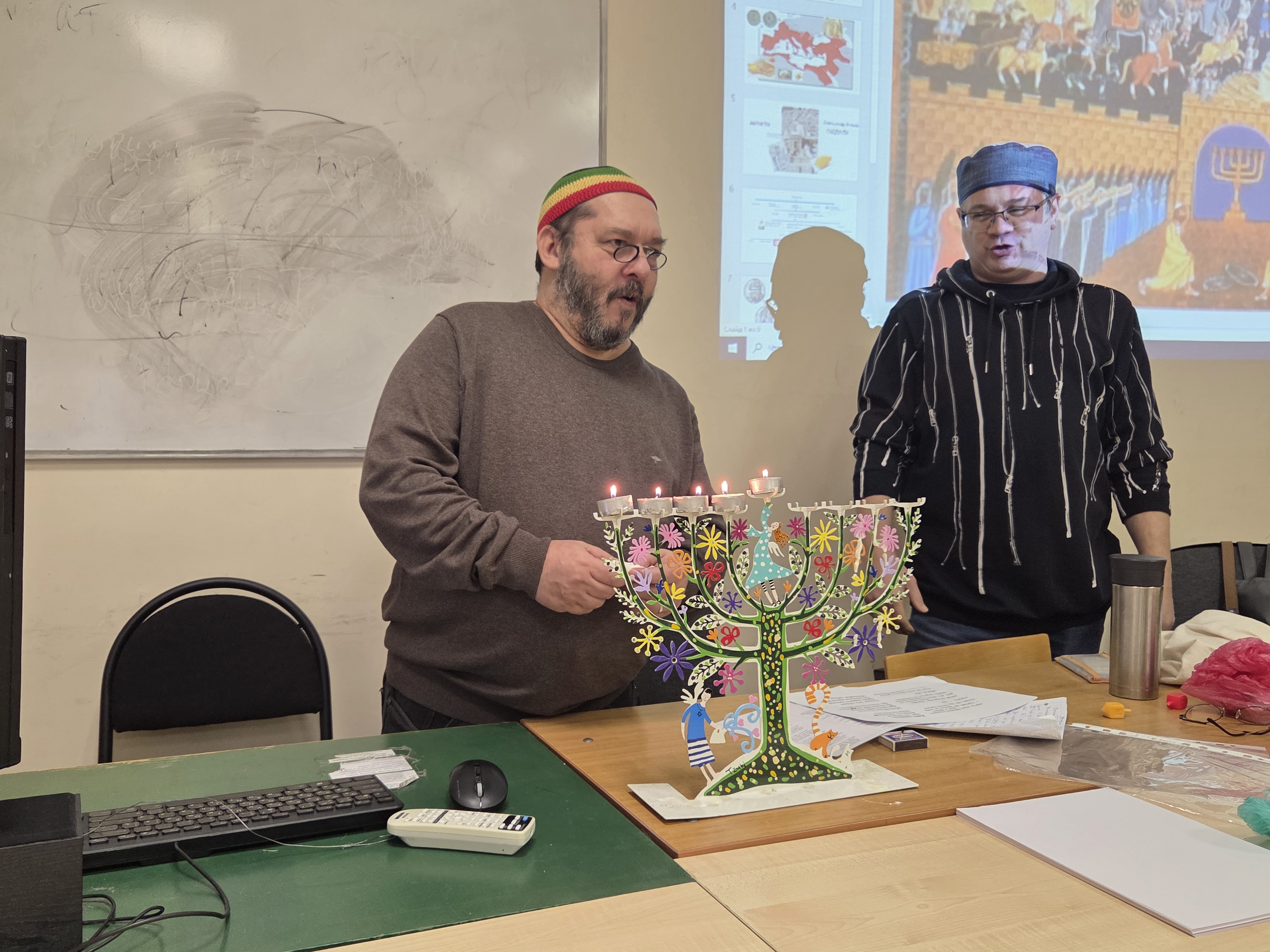 В самом начале праздника наш гость – кантор Центра современного иудаизма в Москве Дмитрий Карпенко и наш преподаватель Леонид Матвеевич Дрейер зажгли ханукальные свечи и спели самый известный из ханукальных пиютов — «Маоз цур» («Твердыня, скала спасения моего»). Этот пиют, написанный в XIII веке в Германии поэтом по имени Мордехай, не только прославляет чудо Хануки, но и в аллегорической форме пересказывает ключевые моменты еврейской истории.