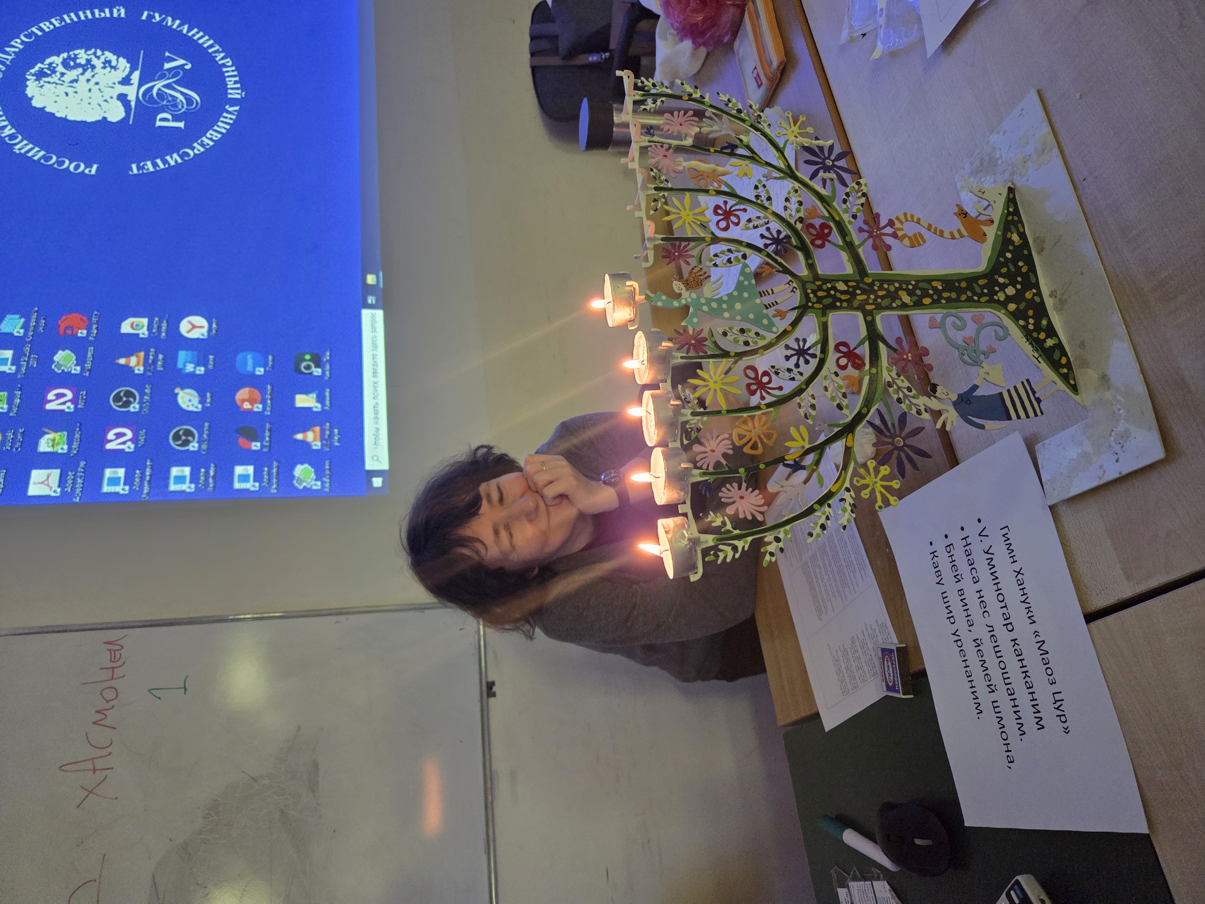 Доцент кафедры Галина Светлояровна Зеленина провела захватывающую интерактивную игровую программу, превратившую лекционный зал в площадку «Маккабиады»: студенты решали задачки, бегали, искали слова-подсказки, «восстанавливали» текст книги Маккавеев, вспоминали самых известных в истории братьев и сестер, соревновались в интеллектуальной визуальной викторине, посвященной ханукиям в разных городах мира.