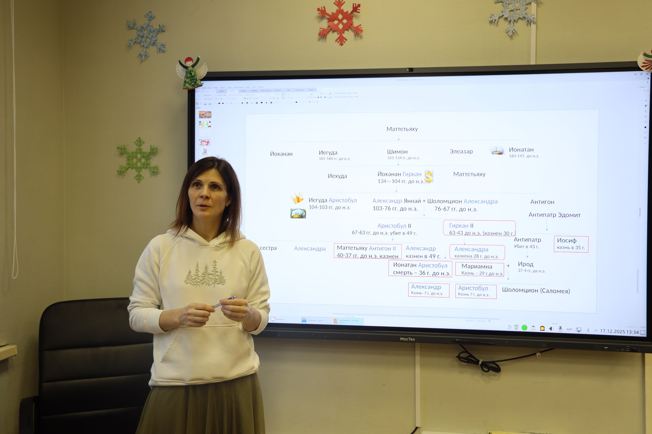 18.12.2025 17 декабря 2025 года, в предпраздничные дни Хануки, состоялась открытая лекция для школьников «Последняя битва династии Хасмонеев». Мероприятие провела заведующая КТИБИ, кандидат исторических наук Светлана Викторовна Бабкина.