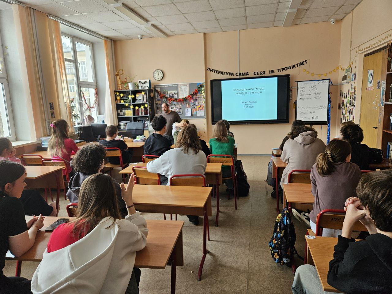 В школе № 1540 прошла лекция Леонида Матвеевича Дрейера, посвященная анализу событий, изложенных в библейской книге Эстер (Есфирь). В ней говорится о спасении иудеев персидской империи Ахеменидов от истребления, которое задумал злодей Аман, визирь царя Ахашвероша. Однако коварный замысел Амана провалился, и сам он был казнен вместе со своими сыновьями. В память об этих событиях был установлен праздник Пурим, который празднуется ежегодно 14–15 адара по еврейскому календарю (в 2026 г. приходился на 3–4 марта).