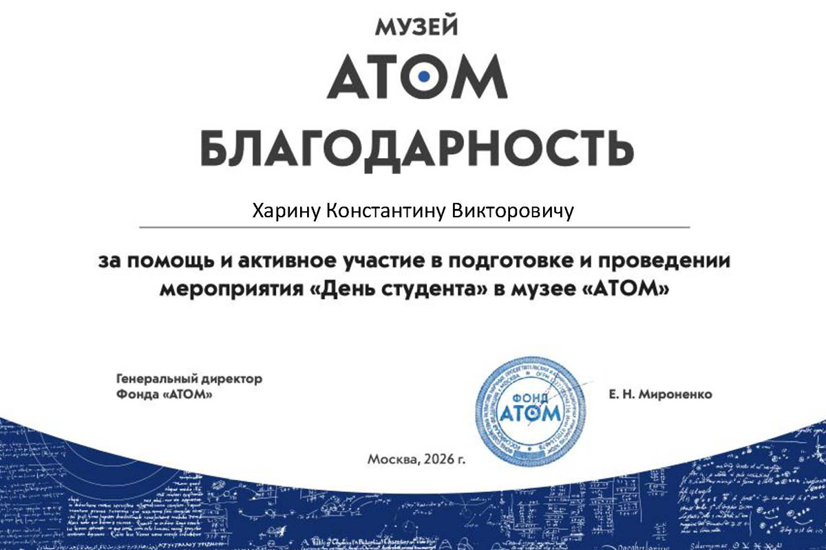 5 марта. Благодарности сотрудникам МИНОТ за участие в мероприятиях Дня российского студенчества Генеральный директор Фонда «Атом» Е.Н. Мироненко выразил благодарность за помощь и активное участие в подготовке и проведении мероприятия «День студента» в музее «Атом» на ВДНХ сотрудникам МИНОТ Кувшинову С.В. и Харину К.В. Мероприятие объединило студентов и представителей ведущих учебных заведений России на одной из самых инновационных площадок страны. В этот день ведущие вузы Москвы представили на площадке музея интерактивные выставки, мастер-классы и инженерные проекты. МИНОТ в рамках направления «Научно-популярный туризм» представил выставку постеров с дополненной реальностью, посвященную научному и инженерному гению всех времен и народов – Леонардо да Винчи.