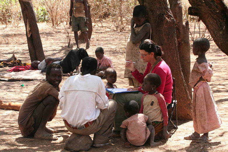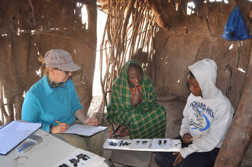 М.Л. Бутовская проводит опросы на выявление традиционных моральных установок с использованием рисуночных тестов среди датога. Мангола. Танзания. 16.08.2018. Фото Р.О. Бутовского