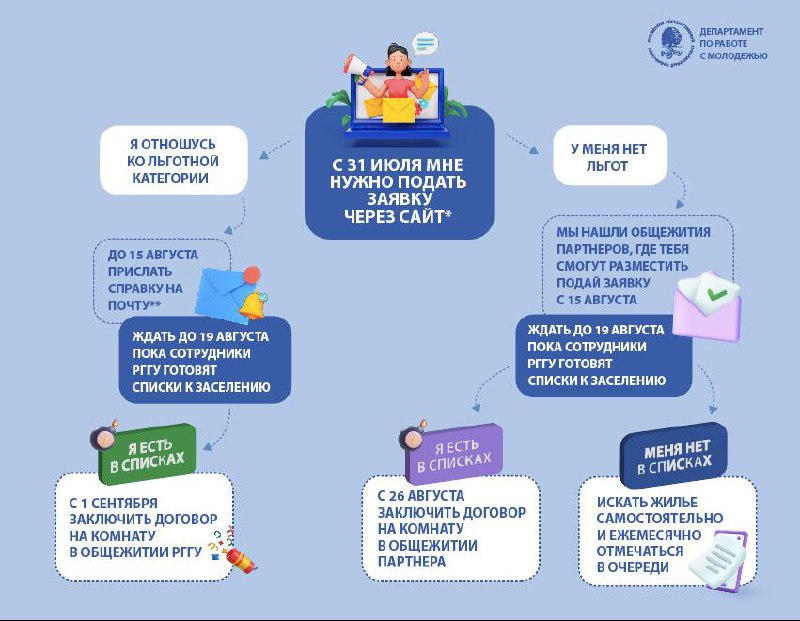 Подача заявок для постановки в очередь на получение места в общежитии РГГУ начинается 31 июля 2025 года.