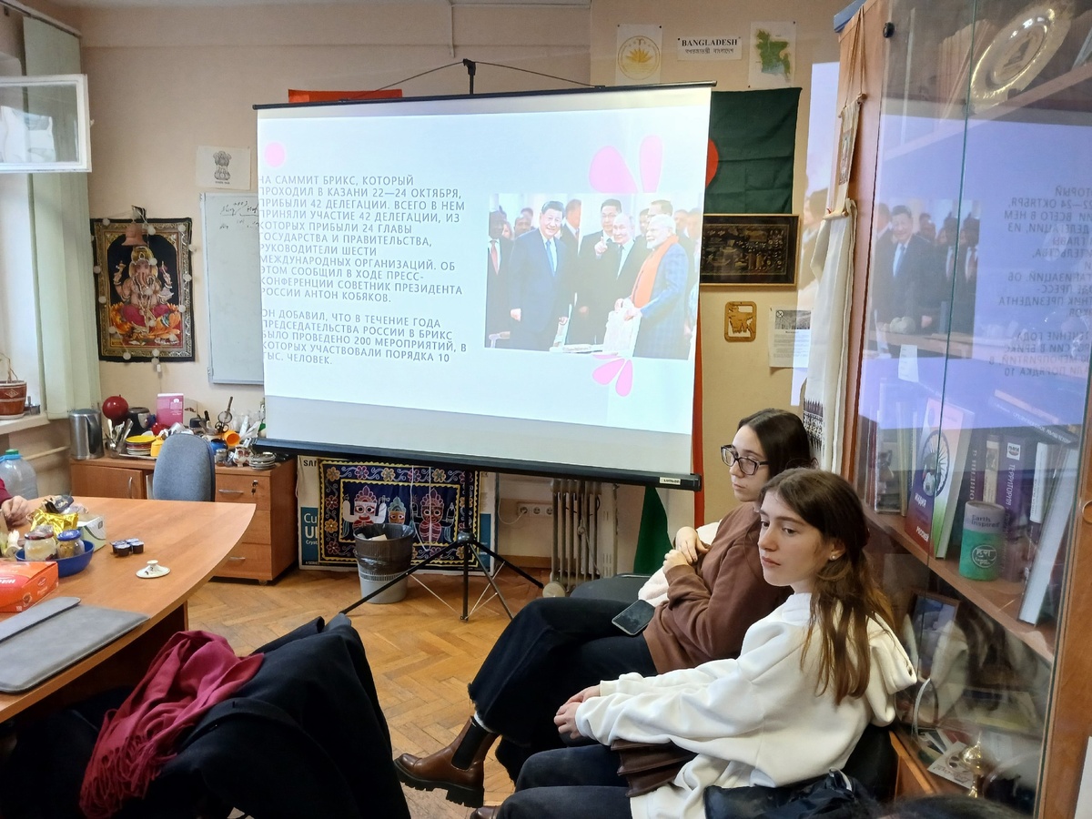 Elizaveta Albitskaya, a 4th-year student of the Faculty of International Relations, Political Science and Foreign Regional Studies Institute of the Histort and Archives, spoke about her direct participation in the BRICS Summit as a volunteer. She noted that the Summit was attended by approximately 20,000 guests and presented slide show on how the meeting of heads of various countries who arrived for the Summit was held, on the negotiations between the heads of state and the final resolution on the meetings.