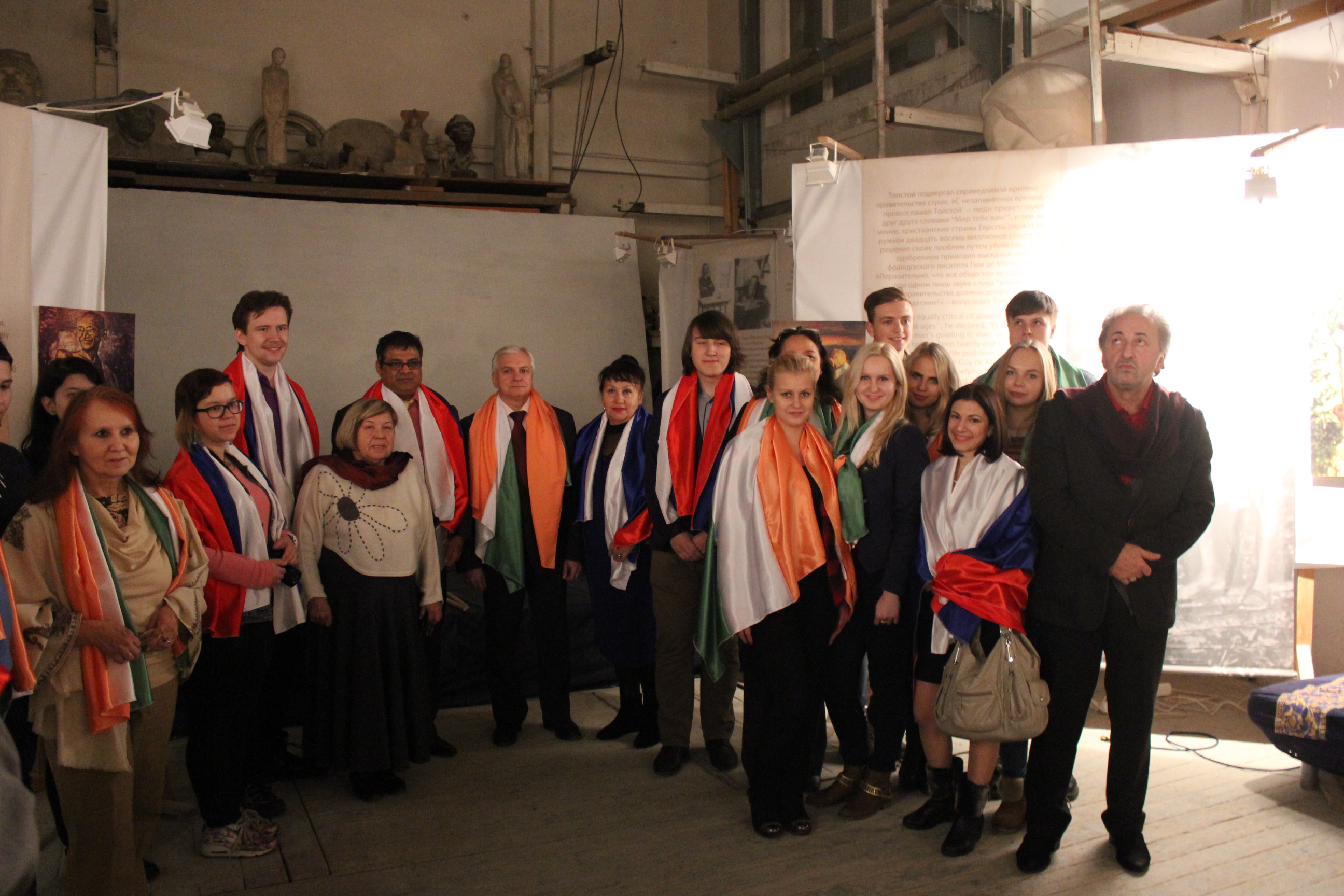 A film about Mahatma Gandhi and Leo Tolstoy was showed on the stage. There was an exhibition of "Mahatma Gandhi and Leo Tolstoy: the unique heritage" illustrating their unique correspondence on the topic of non-violence.