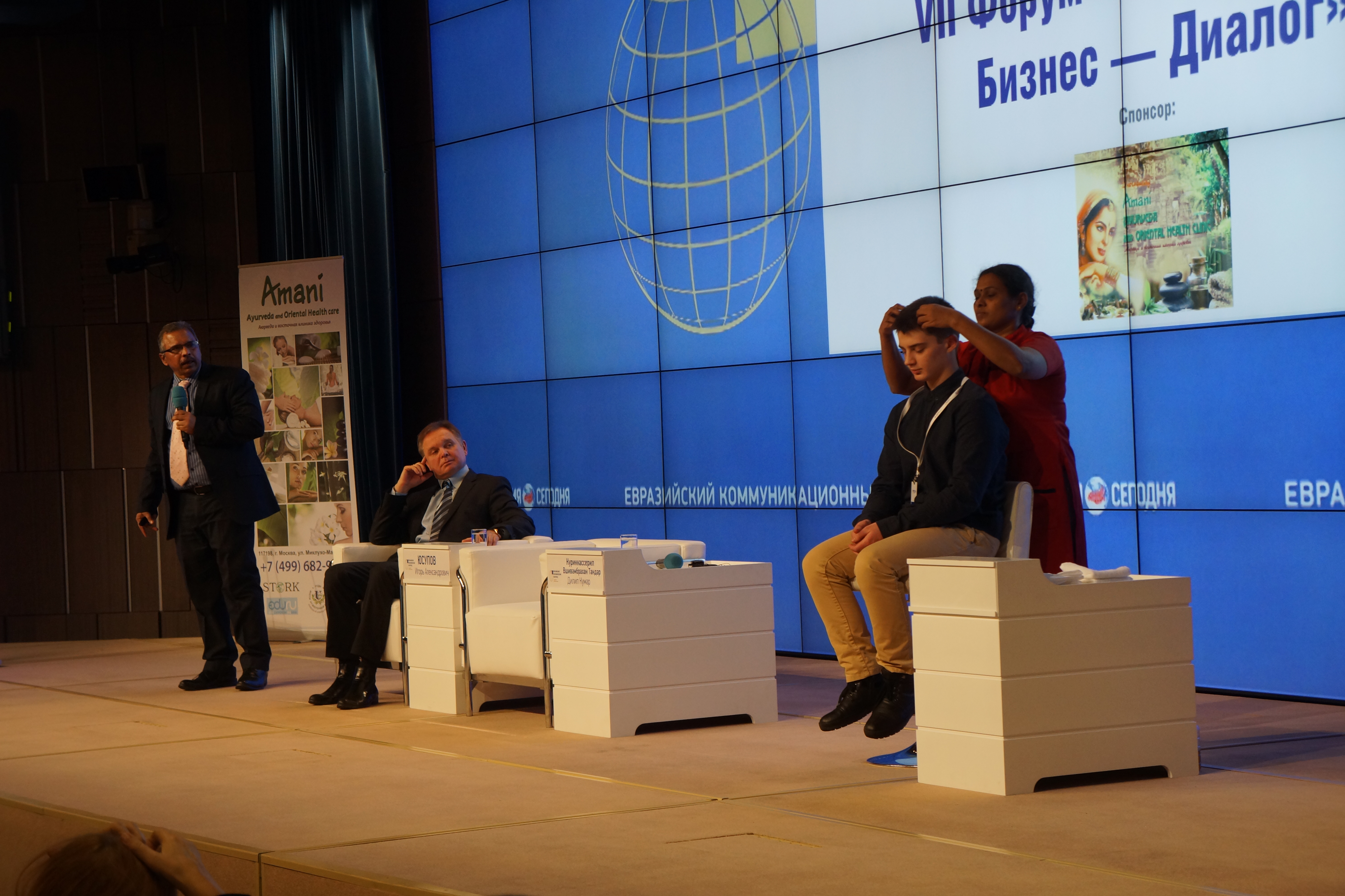 Among the participants of we can Mr. Igor Yusupov, Director of East Medicine Institute of Russian Friendship University (RFU) and Mr. K.V. Dilipkumar, Professor of East Medicine Institute of RFU presented their reports at the “Ayurveda” panel. After that Ayurveda massage and asana yoga were demonstrated to the audience.