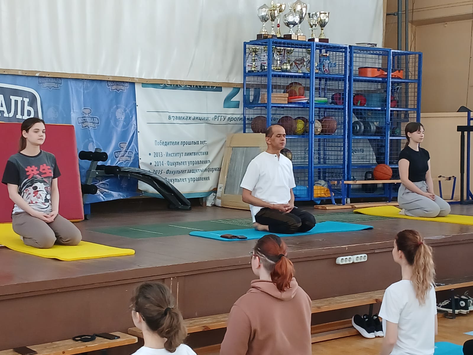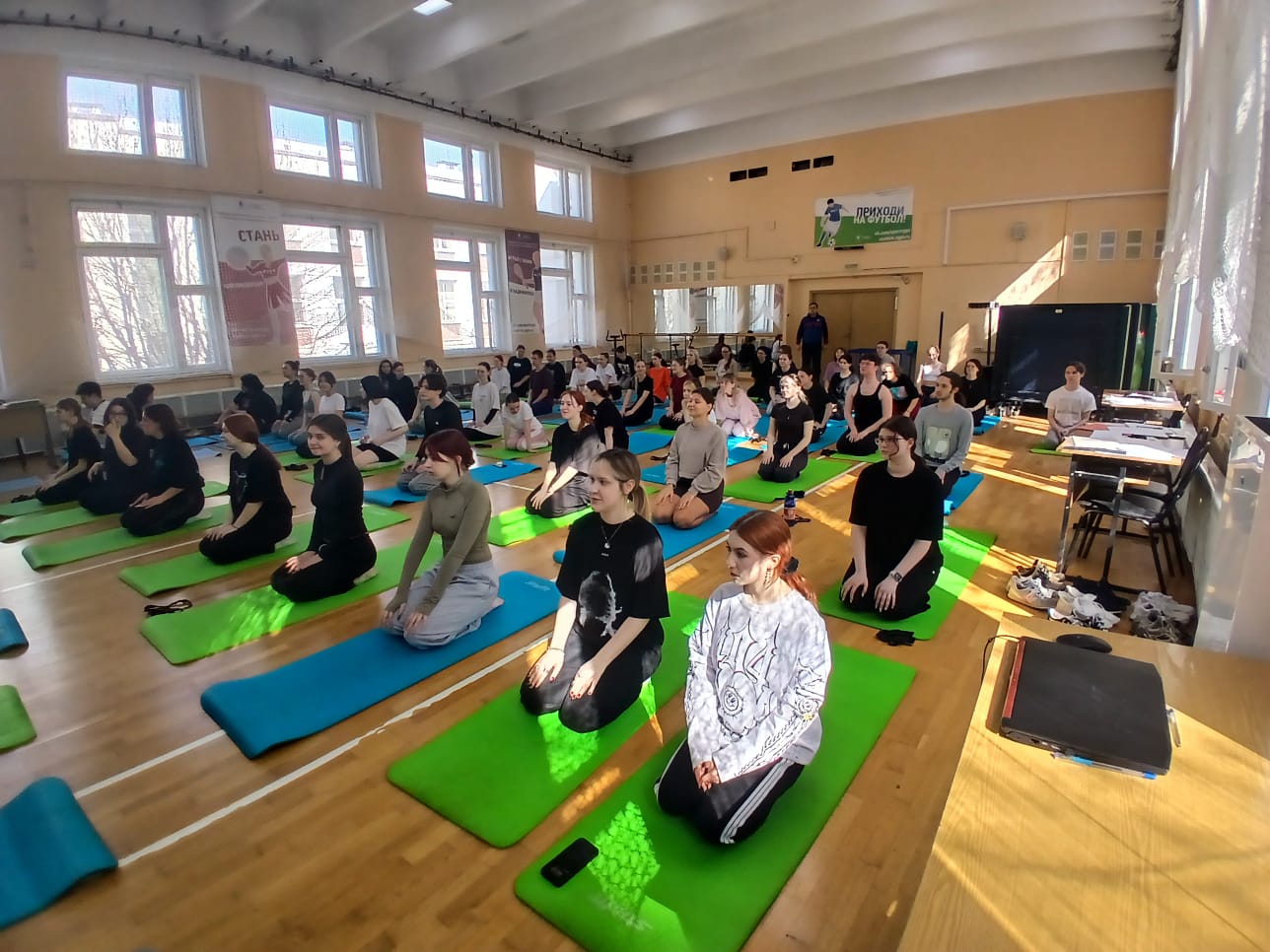 More than 70 students studied yoga asanas laiding on the yoga mats in the University gym hall.