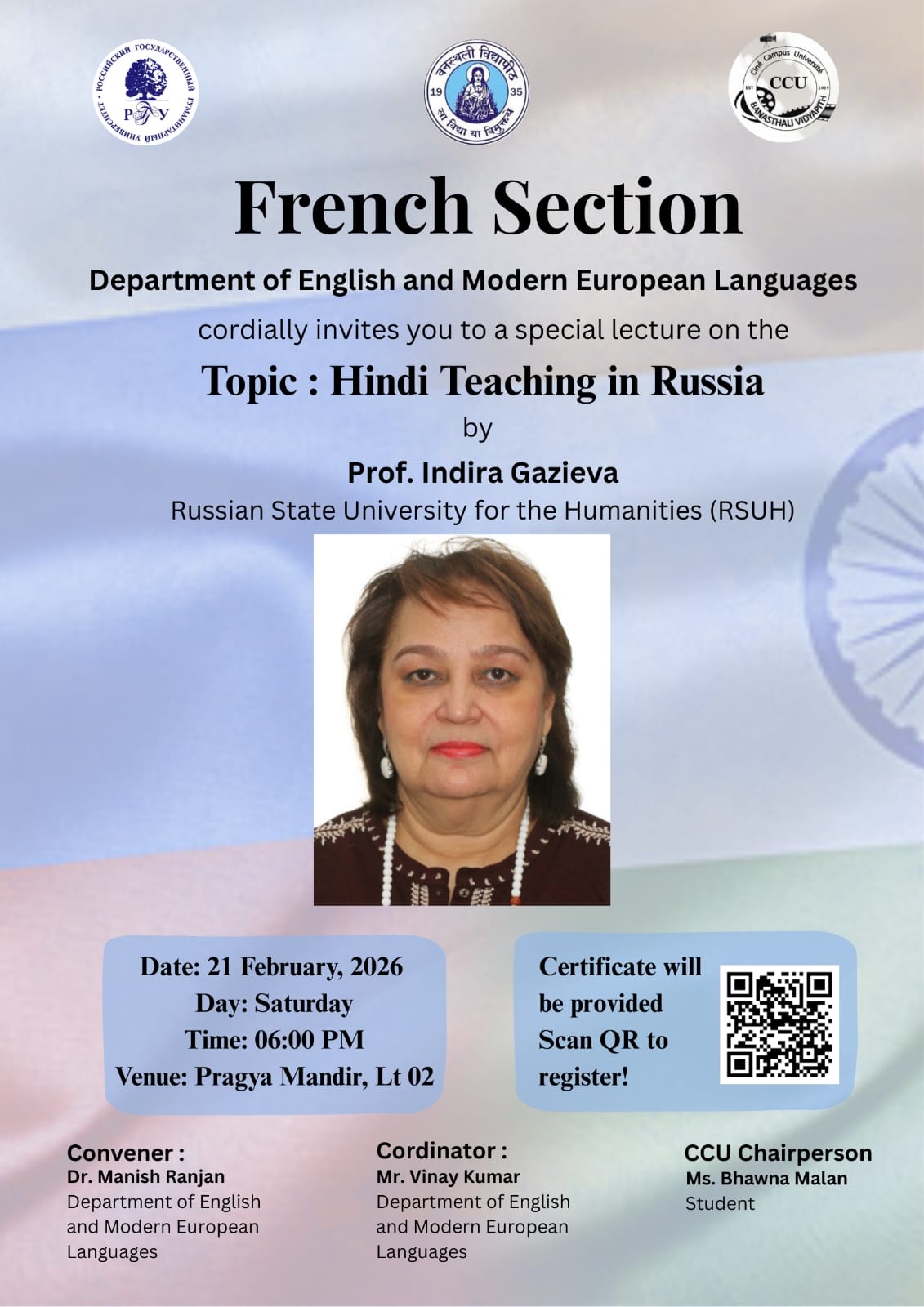 Indira A. Gazieva, Associate Professor of the Department of East Languages at the Institute of Linguistics at the Russian State University for the Humanities, delivered a lecture on the development of Hindi studies in Russia to the Banasthali Vidyapith University (Rajasthan, India) students.