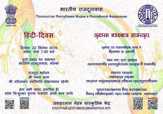 Bhartiy Raajdootavas Moscow mai Hindi Divas Samaroh ka aayojan 22-9-2016 ko Durga Prasad Dhar Sabhagar main kiya jayega...aap sabhi sadar amantrit hain..