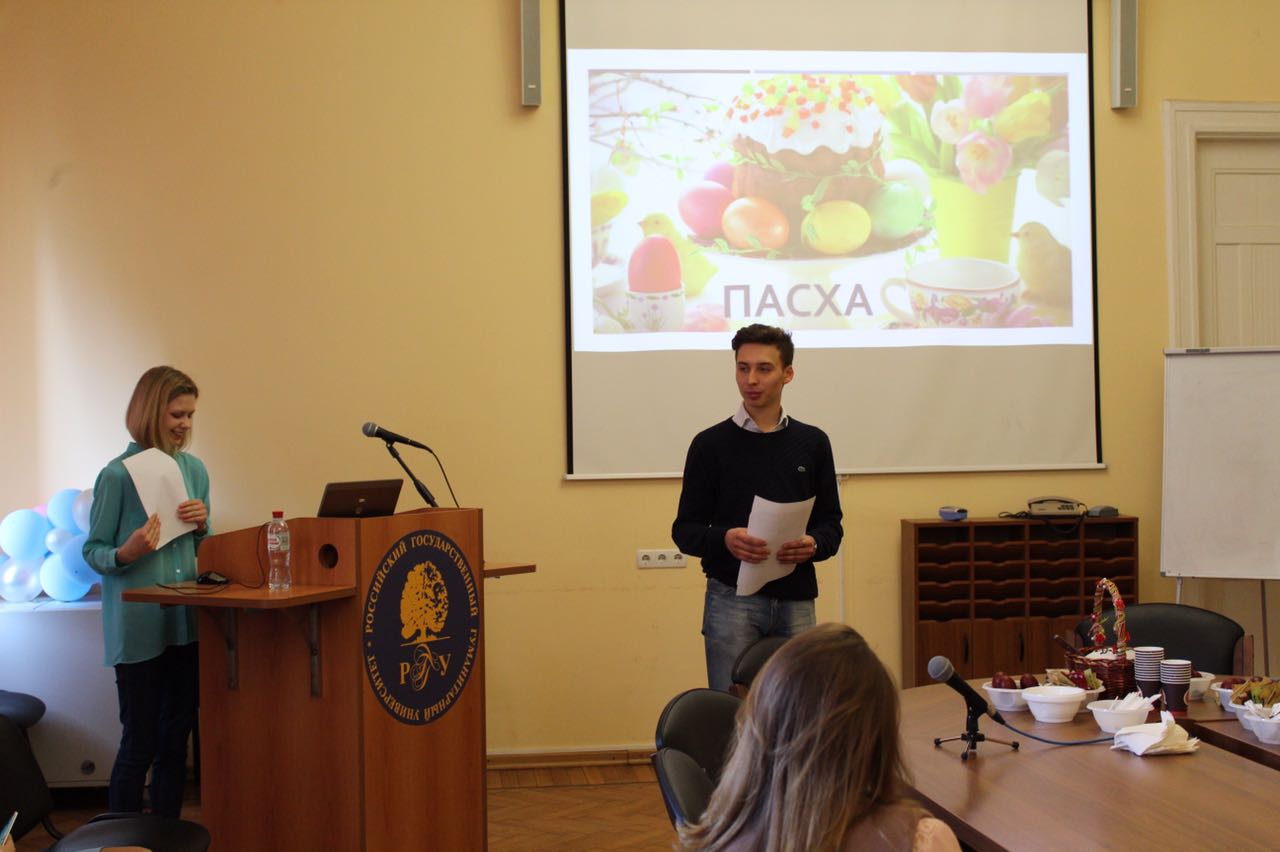 9 апреля 2018 года в РГГУ прошло празднование Пасхи совместно с иностранными студентами, обучающимися в университете в рамках программы международной академической мобильности. Данное мероприятия было организовано Управлением международных связей при участии студентов Факультета международных отношений и зарубежного регионоведения.