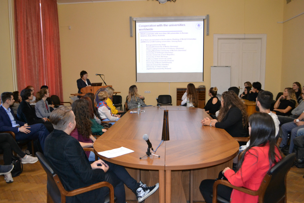 Встреча началась с презентации Веры Ивановны Заботкиной, проректора по международному сотрудничеству, о жизни и международной деятельности университета. С приветственным словом перед иностранными студентами выступили сотрудники Управления международных связей и студенты РГГУ.