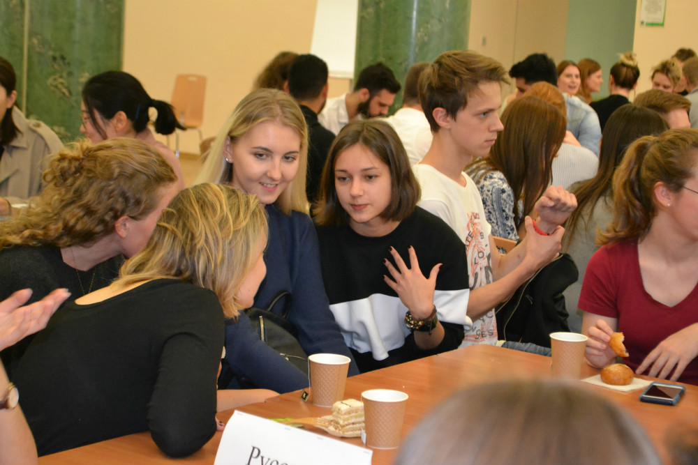 Завершилась встреча совместным чаепитием иностранных студентов и студентов РГГУ в колонном зале столовой в рамках программы «Тандем». В этом семестре в данном мероприятии приняло участие более 120 студентов. Программа «Тандем» это программа языкового и культурного обмена, организуемая в РГГУ на базе Управления международных связей.