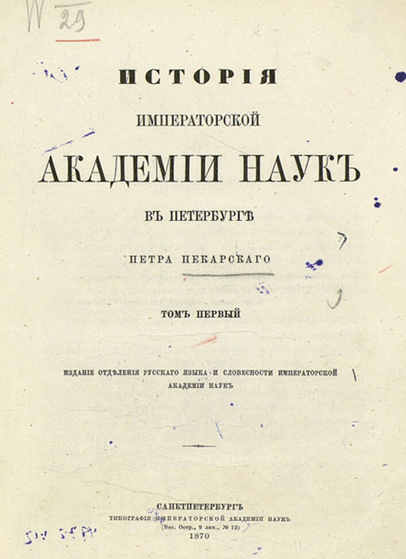 На выставке представлена раритетная книга – первый том «Истории императорской Академии наук в Петербурге» исследователя русской литературы и истории, библиографа П.П. Пекарского. В неё вошли письма членов ученого сообщества, протоколы академических заседаний, а также рукописные издания. Данная работа Пекарского имела огромное значение для исследований его современников в области истории образования, культуры и просвещения, а также библиографии и книжного дела.