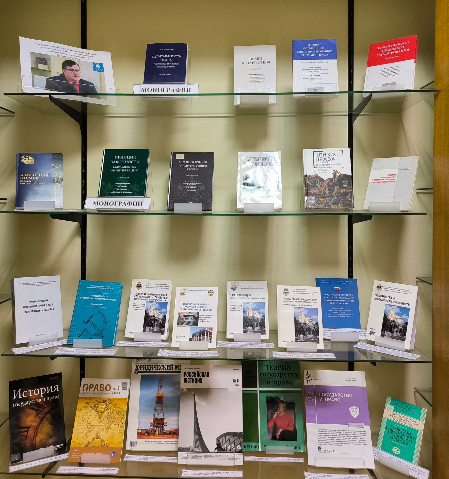 У входа в Читальный зал открыта книжная выставка, подготовленная к 50-летнему юбилею доктора юридических наук, профессора кафедры истории и теории государства и права Института правоведения Владислава Валерьевича Денисенко.