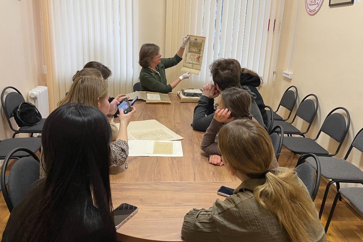 РГАЛИ — крупнейшее хранилище в России, в котором сосредоточены материалы по истории отечественной литературы, музыки, театра, кино, изобразительного искусства, архитектуры. Начальник отдела архива Н.Ю. Грянченко рассказала экскурсантам об истории основания учреждения, а также ознакомила студентов с составом собраний и коллекций. Будущим реставраторам были продемонстрированы некоторые документы, хранящиеся в РГАЛИ: автограф А.С. Пушкина, выпись из метрической книги о рождении С.А. Есенина, фотографии В.Е. Татлина, портрет К.И. Чуковского, выполненный И.Е. Репиным, альбом С.Д. Пономаревой с записями и рисунками писателей и художников и др.