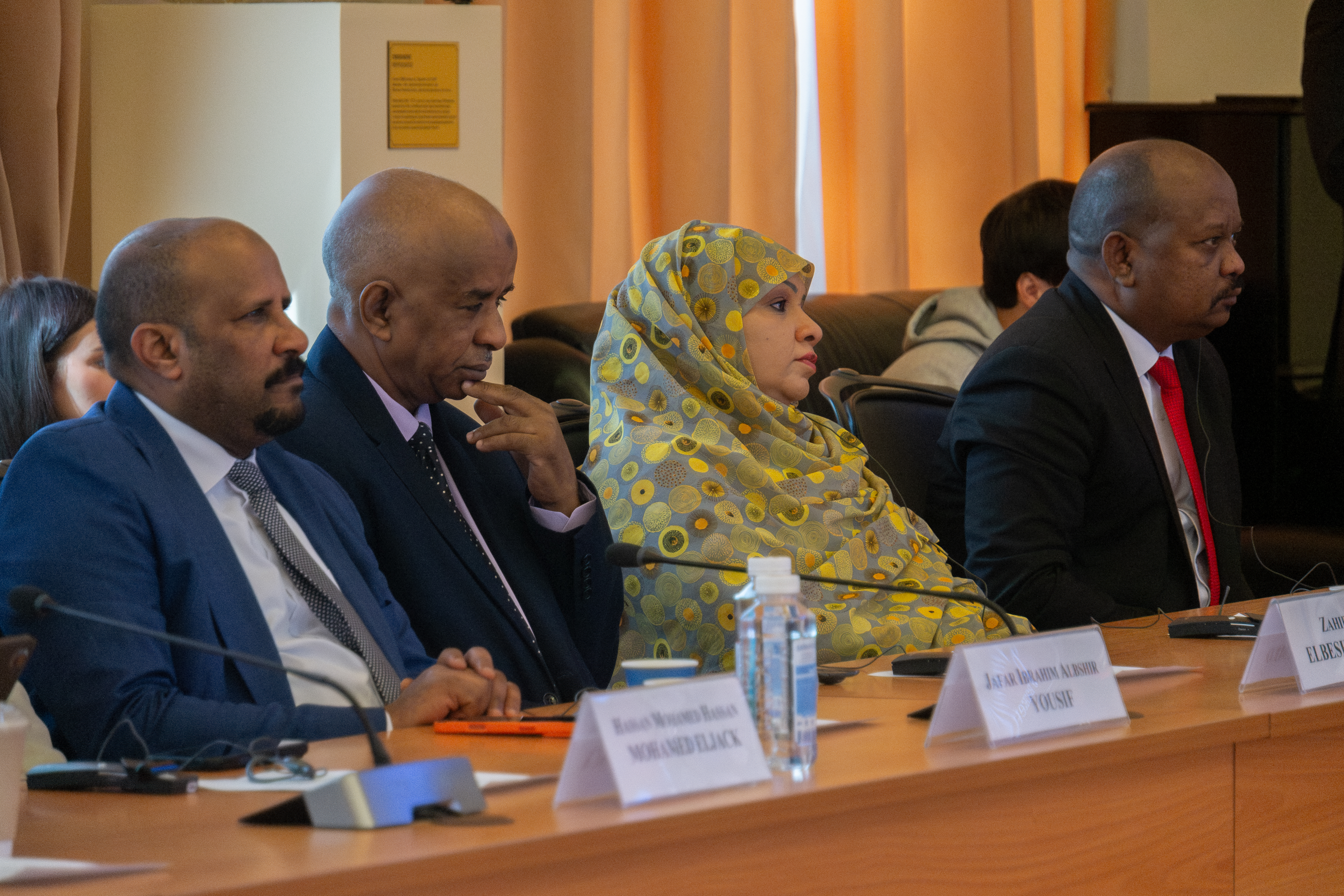 «Мне очень приятно находиться сегодня здесь, в этом престижном академическом учреждении, Российском государственном гуманитарном университете. Празднование 70-й годовщины установления дипломатических отношений между Суданом и Россией имеет особое значение и заставляет нас вспомнить некоторые моменты из нашей общей истории. Дипломатические отношения между нашими странами были установлены 5 января 1956 года, всего спустя 5 дней после обретения Суданом независимости. Россия всегда поддерживает Судан с момента начала мятежа в нашей стране, активно выступая на международных форумах против подрыва суверенитета и территориальной целостности Судана. Обращаем слова самой глубокой благодарности правительству и российскому народу за эту честную и достойную позицию», — Чрезвычайный и Полномочный Посол Республики Судан в РФ господин Мохаммед Сиррадж выразил благодарность в своей приветственной речи.