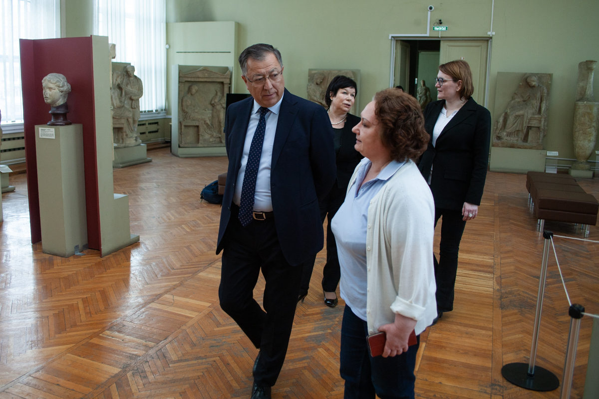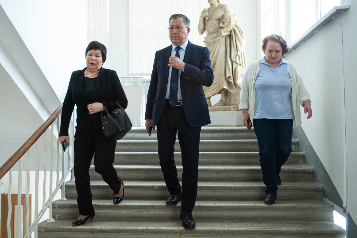 Встреча завершилась обменом памятными подарками между ректорами РГГУ и КазНУ, после чего для представителей Казахского национального университета была организована экскурсия по залам Музейного центра РГГУ.