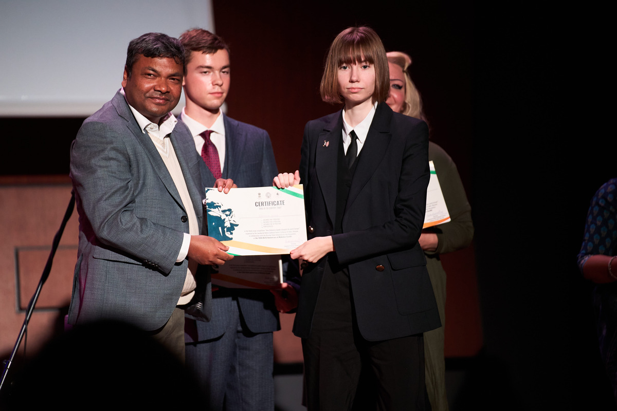 2 октября 2024 г. были подведены итоги конкурса по написанию эссе на языке хинди на тему «Как Махатма Ганди навсегда изменил мир?». Российские студенты и знатоки языка хинди прислали свои сочинения о жизни Ганди, его борьбе за независимость, ненасильственном сопротивлении и духовных принципах. По этому случаю студенты, изучающие графический дизайн в Учебном центре «Арт-Дизайн», под руководством преподавателей Казьминой Анны Владимировны и Ененко Елены Артемовны подготовили 30 постеров, посвященных жизни и философии Махатмы Ганди. В зале Шнитке Московского международного Дома музыки были выставлены 10 творческих работ студентов: Татьяны Глазовой, Алины Незамаевой, Анастасии Васильевой, Валерии Шорваевой, Владислава Иванова, Ляман Бабаевой, Алины Бабкиной, Полины Сотниковой и Екатерины Левкиной.