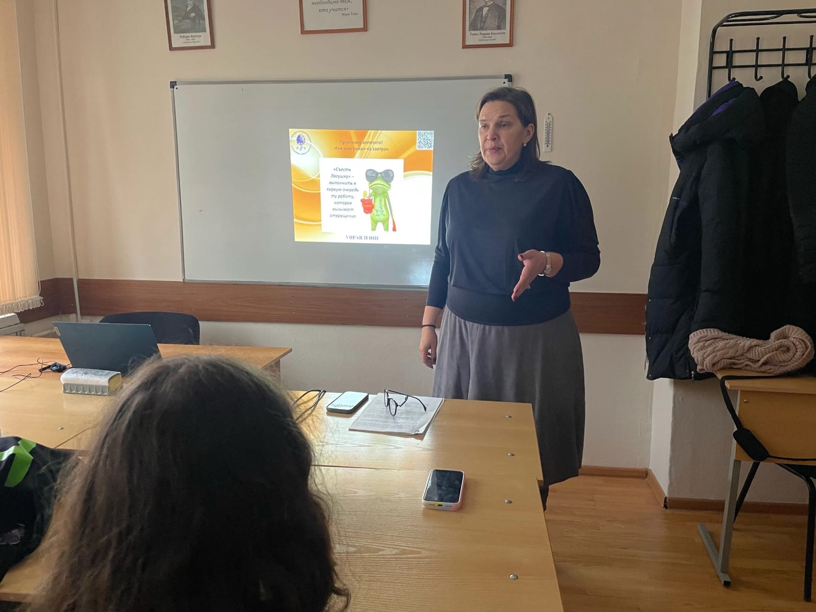 М.А. Лашкевич рассказала студентам, что такое тайм менеджмент, как управлять временем эффективно, какие существуют методы и инструменты тайм-менеджмента. В ходе беседы были обозначены основные принципы тайм менеджмента. Встреча была направленна на развитие навыков управления временем и повышение собственной продуктивности.