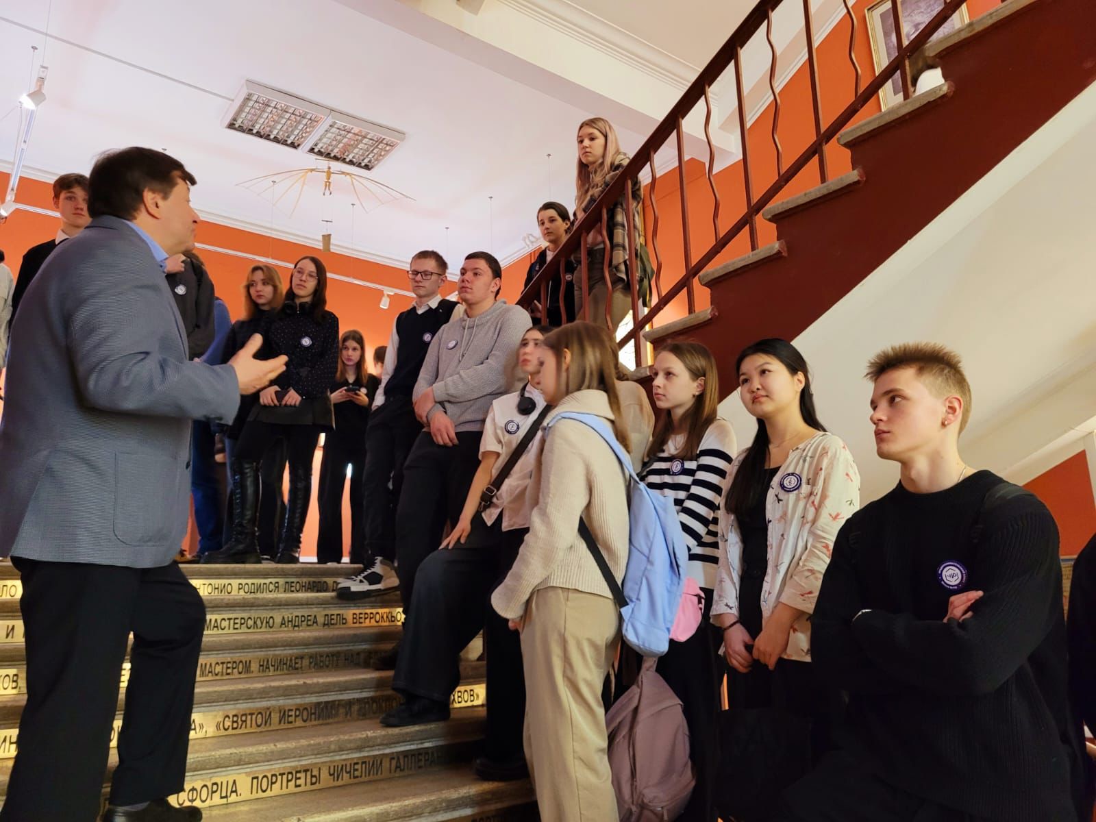 Знакомство с вузом началось с экскурсии в музей-мастерскую 3DaVinci, где школьники подробнее узнали о музее и его экспозиции, увидели коллекцию редких книг, посвященных да Винчи, хранящихся в библиотеке РГГУ. Экскурсию проводил директор Международного института новых образовательных технологий Кувшинов Сергей Викторович. Каждый из экспонатов музея, реальный и виртуальный, представляют собой органичный сплав науки, искусства и высоких технологий. На выставке можно потрогать любой экспонат, в 3D-очках видно изобретения Леонардо да Винчи в действии, а через приложение на телефоне можно сделать фотографию и даже видео держа в руках одно из изобретений (картинка оживает). Также ребята посмотрели небольшой фильм о жизни и творчестве гениального мастера всех времен и народов – Леонардо да Винчи.