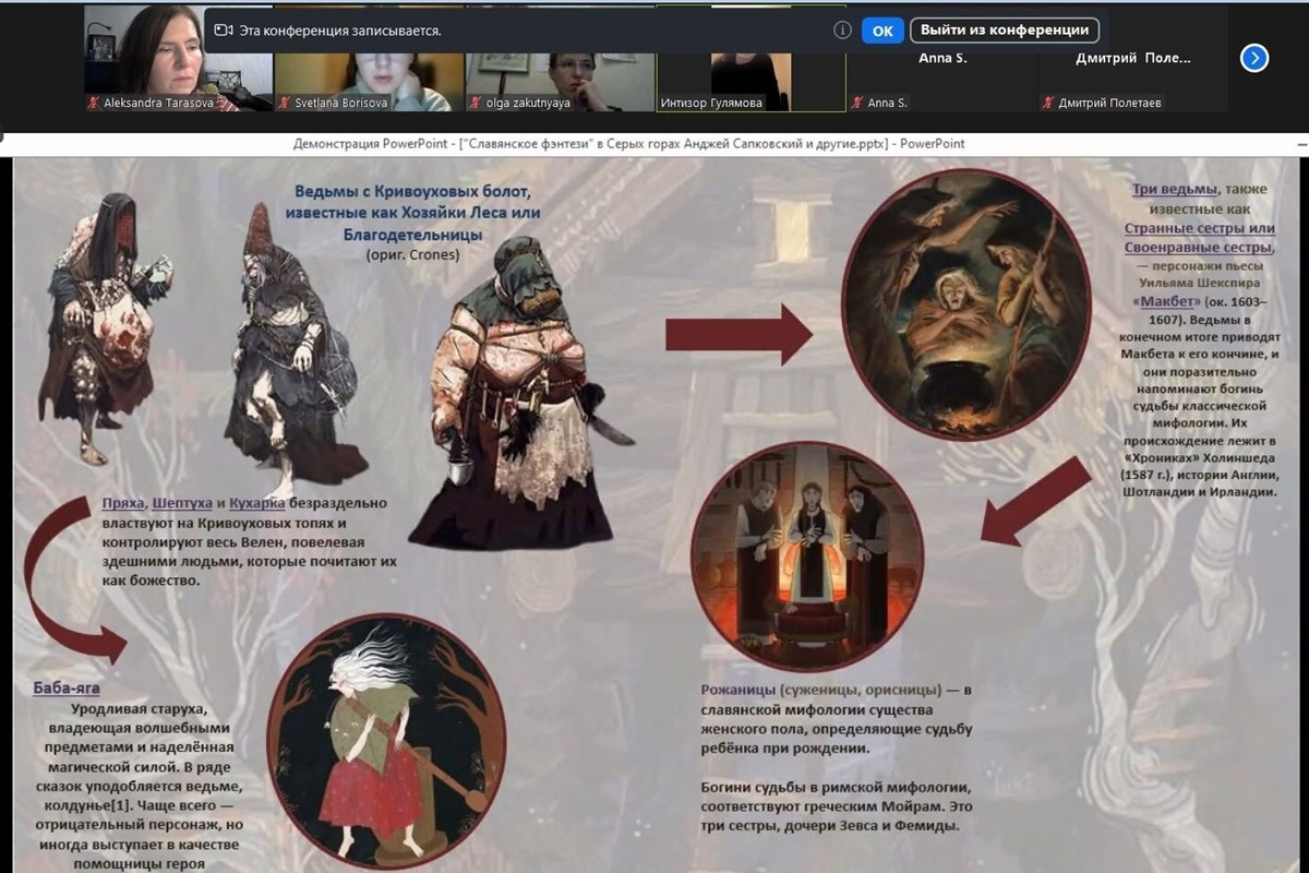 Продолжила доклад кратким анализом репрезентации славянской мифологии в видеоигре «Ведьмак» по мотивам одноименной саги Анджея Сапковского соорганизатор и ассистент семинара, магистр культурологии Интизор Гулямова. В докладе были отмечены особенности встраивания славянской мифологии в механику игры и опыт реципиента – игрока, а также раскрыты отсылки, наблюдаемые в атрибутах славянской мифологии, представленных в видеоигре, к другим текстам культуры, в частности, к польской литературной классике эпохи романтизма и произведениям Уильяма Шекспира.
