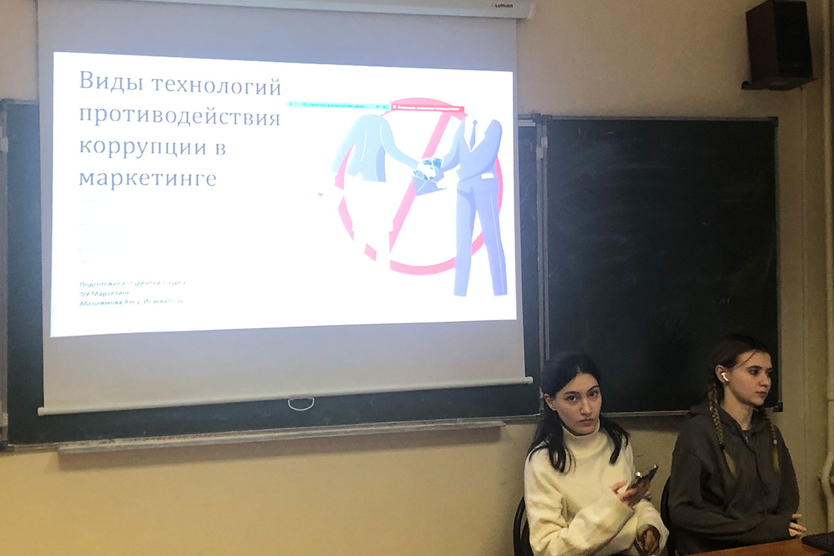 Далее участники круглого стола выступили с докладами, которые сопровождались красочными презентациями. Егор Сыроваткин (профиль «Маркетинг», бакалавриат, 3-й курс) рассказал о значении применения технологий противодействия коррупции в маркетинге. Юлия Бодрёнок и Анастасия Чжен (профиль «Маркетинг», бакалавриат, 3-й курс) в своём выступлении осветили понятия и принципы противодействия коррупции в маркетинге. С докладом о видах технологий противодействия коррупции в маркетинге выступили Алсу Абсолямова и Роза Исаева (профиль «Маркетинг», бакалавриат, 3-й курс). О социальной рекламе в российской антикоррупционной политике рассказали Дарья Филиппова и Генрих Шефер (профиль «Маркетинг», бакалавриат, 3-й курс). Алёна Перова и Валерия Михайлова отметили маркетинговые стратегии противодействия коррупции: опыт Российской Федерации и Китайской народной Республики. Об опыте борьбы с коррупцией в различных странах доложила Дарья Шубина (профиль «Маркетинг», бакалавриат, 3-й курс). Милена Крапивская (профиль «Маркетинг», бакалавриат, 3-й курс) рассказала о механизме профилактики коррупции посредством СМИ.