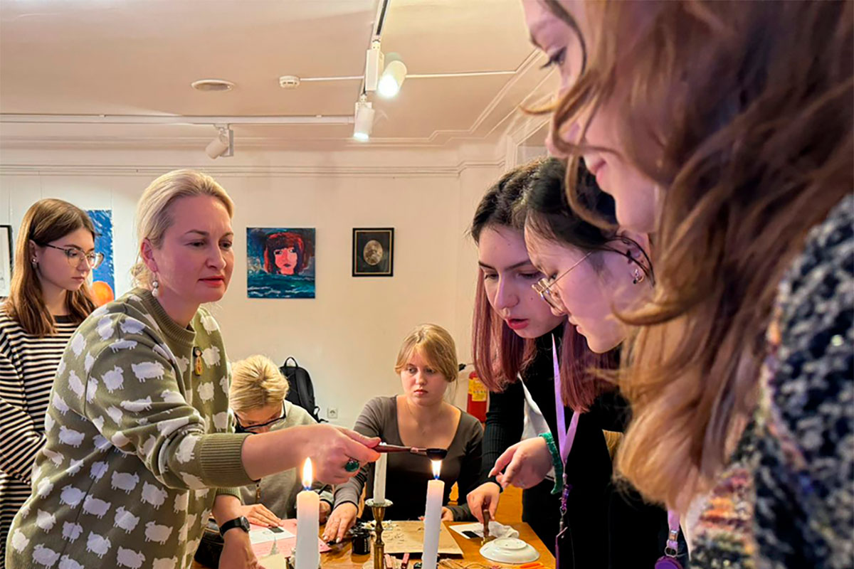 Студенты ФАД ИАИ РГГУ Юлия Поштар, Екатерина Антонова, Валерия Дадобоева, София Хертек и другие помогли разобраться участникам программы в типах и стилях дореволюционного письма, и рассказали, как правильно писать перьями и запечатывать конверты сургучной печатью.