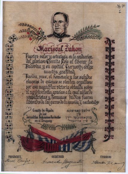 В нём на испанском языке и на идиш выражена благодарность маршалу за спасение от фашистской Германии евреев города Черновцы: «Ваша храбрость и стратегия в руководстве славной Красной Армией при освобождении Буковины и ее столицы Черновиц вызывает нашу благодарность… Примите же почтение и искренние приветствия тех, кто гордится этой великолепной победой над фашизмом».