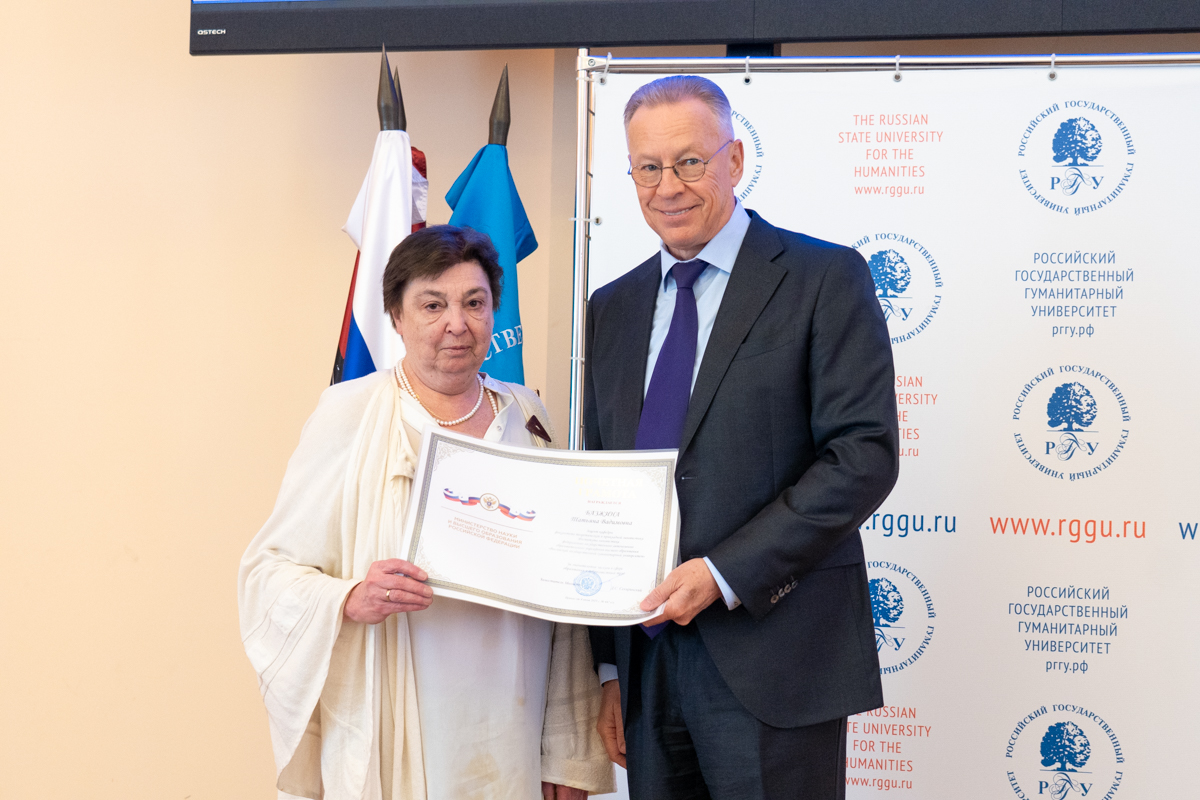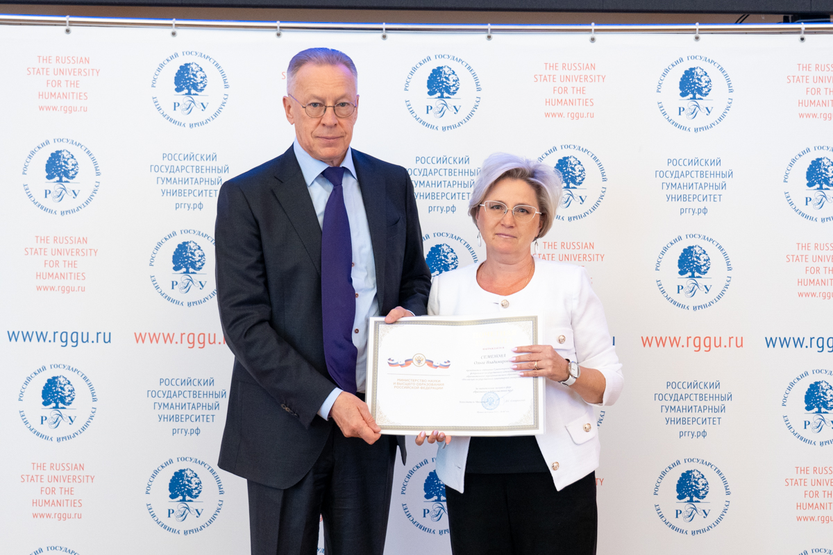 На заседании наградили сотрудников РГГУ, которые внесли значительный вклад в развитие системы высшего образования России. Престижное звание «Почётный работник сферы образования Российской Федерации» было присвоено декану философского факультета Светлане Коначёвой. Почётные грамоты Минобрнауки России вручили доценту кафедры теоретической и прикладной лингвистики Института лингвистики Татьяне Базжиной, директору Научного центра цифровой социологии «Ядов-центр» Ольге Крыштановской, преподавателю Гуманитарного колледжа Ольге Семёновой и профессору кафедры управления факультета управления ИСЭН Галине Шишковой.