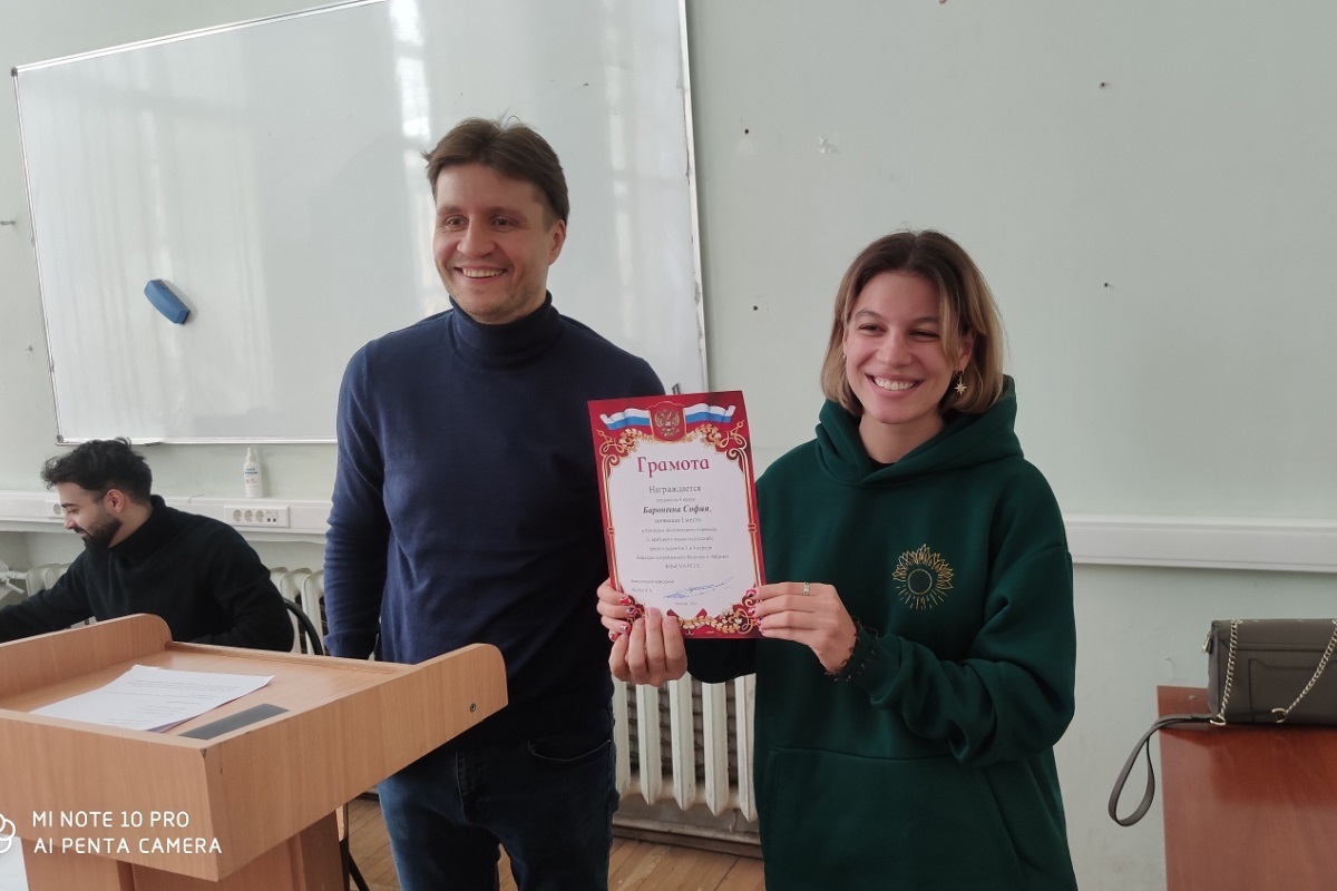 Победителями конкурса стали София Баронина, Софья Наумова и Анна Ворошилова. Второе место у Софьи Дандыль, Любомира Сизова и Артема Колесникова. Третье место – Даниил Малютин, Григорий Стовбун, Андрей Ковалев. В торжественной обстановке им были вручены грамоты заведующим кафедрой современного востока и Африки ВФиСКН Никитой Александровичем Филиным.