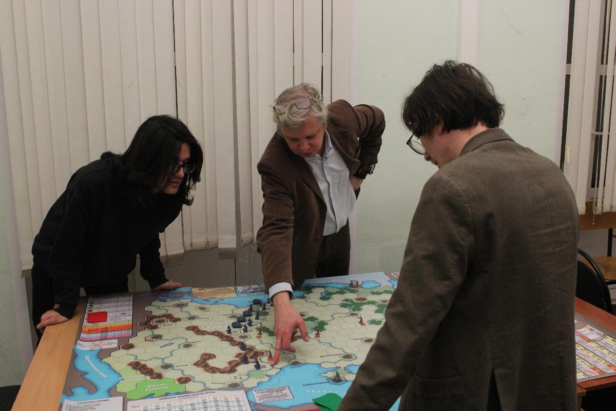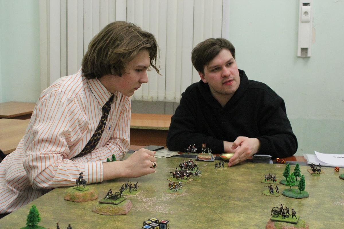 После теоретической части участники имели возможность ощутить себя полководцами в таких играх как «Ни шагу назад!», «Command&Colors. Napoleonics» и «Время усобиц». И разумеется Б.К. Мамонов, руководя процессом, помогал студентам в освоении варгеймов, объясняя сложные правила игр для более полного погружения в военное искусство прошлых эпох .