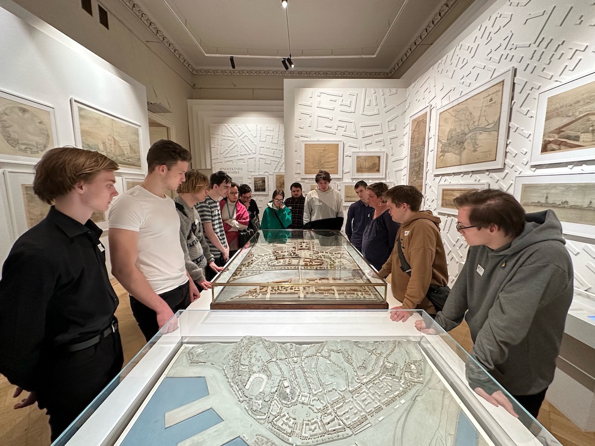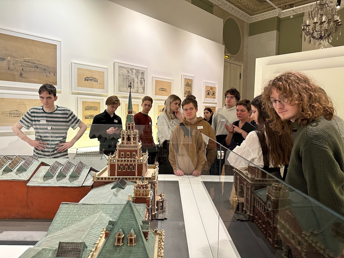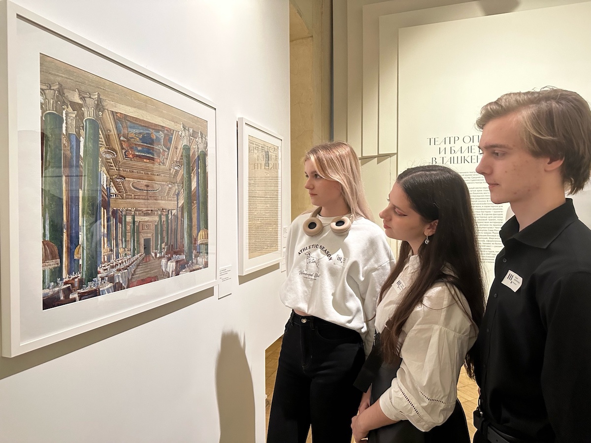 Далее, группа переместилось в особняк Талызина – главное пространство Музея архитектуры. В его залах раскрывается история становления великого зодчего: от его ученических работ в Академии художеств, через первые самостоятельные проекты к главным творениям – Казанскому вокзалу в Москве, Мавзолею В.И. Ленина, Государственному театру оперы и балета имени Алишера Навои в Ташкенте. Хронологическая последовательность выставки, с акцентом на наиболее известные сооружения Щусева, позволила студентам увидеть, как происходила трансформация творческого метода архитектора, точно чувствующего изменения художественных вкусов и реалий времени и тонко реагирующего на них.