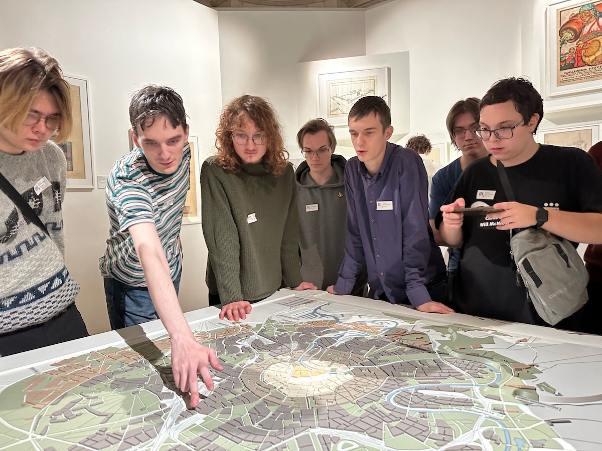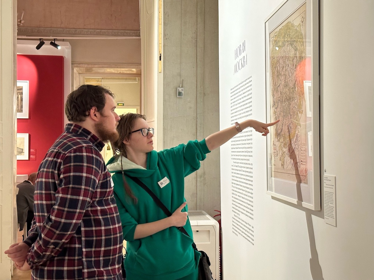 В зале «Новая Москва» наши экскурсанты познакомились с произведениями, созданными в первые советские годы: планом реконструкции столицы «Новая Москва», проектами Всероссийской сельскохозяйственной и кустарно‑промышленной выставки, Дворца труда и Мавзолея В.И. Ленина. Студентов направления «Историческое краеведение» особо впечатлил макет карты, как бы выглядела Москва по проекту её сохранения архитектора А. Щусева. Будущие москвоведы с большим азартом изучали районы и организацию пространства знакомого города.
