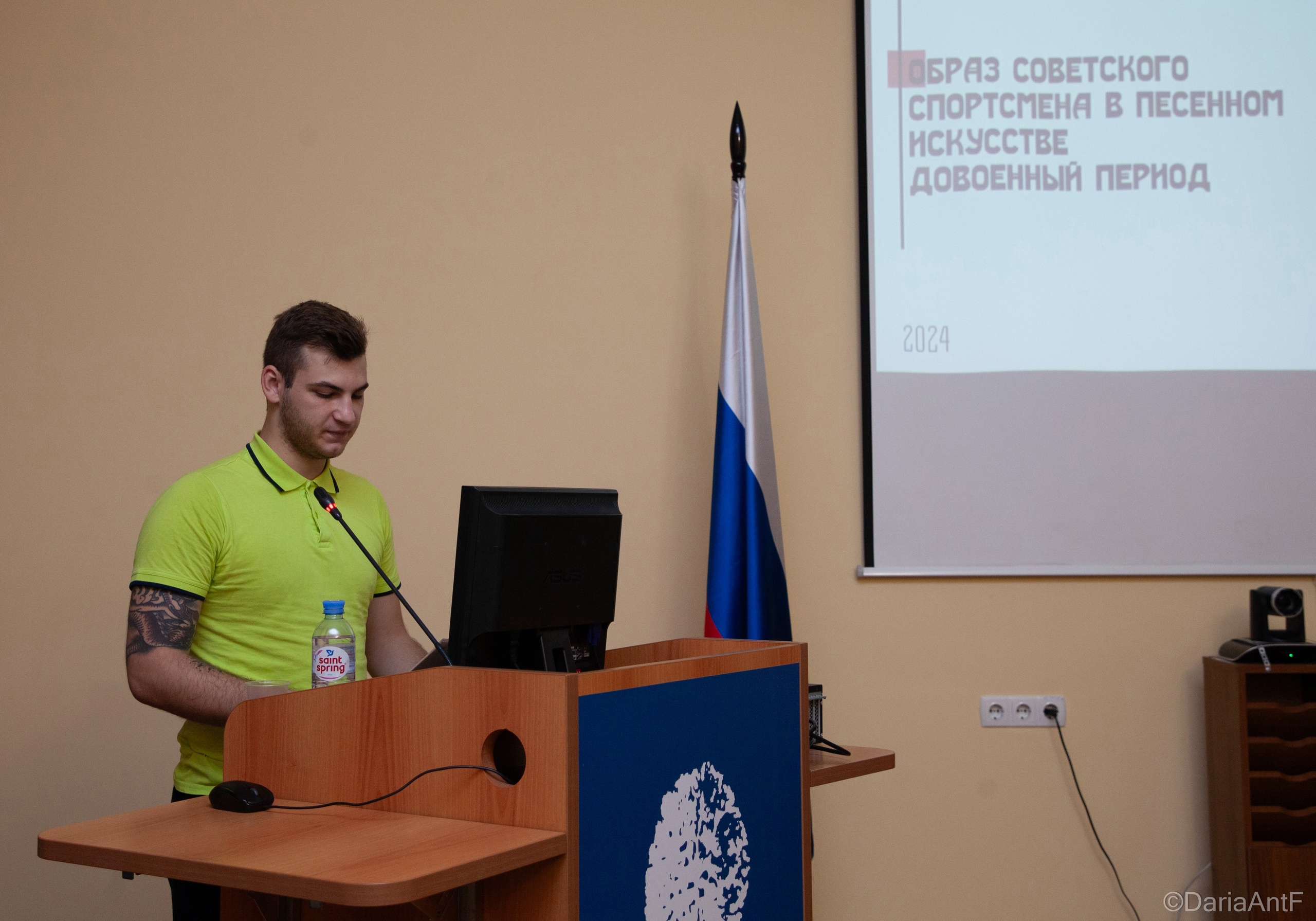 С докладом «Образ советского спортсмена в песенном искусстве: довоенный период» выступил студент Исторического факультета ИАИ РГГУ, Александр Деревянко