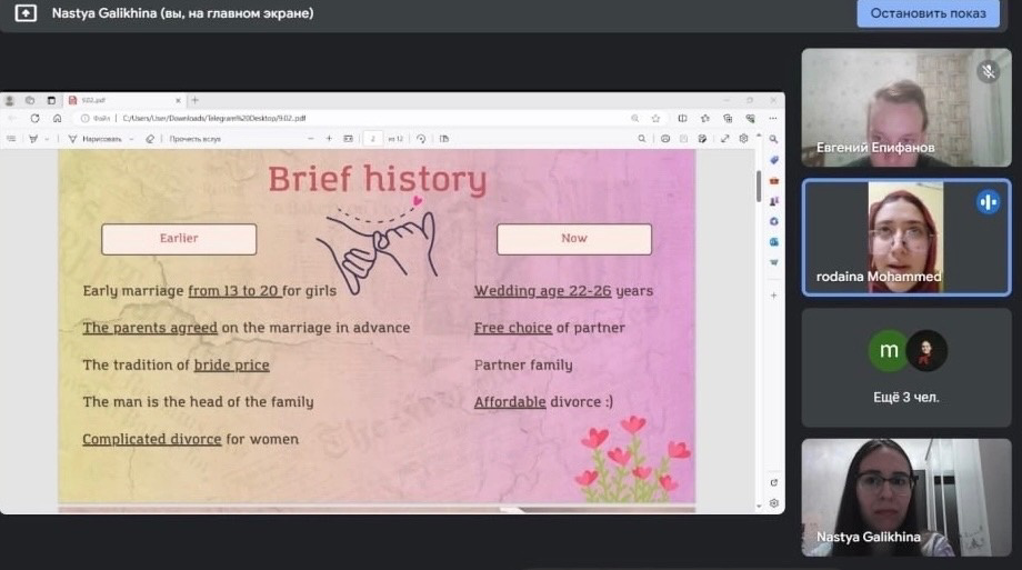 Конечно, данный разговорный клуб позволяет не только поделиться культурным кодом, но и развить навыки говорения на иностранном языке. Участники на подобных встречах говорят на арабском и английском. Была изучена соответствующая лексика, посвященная отношениям. Ребятам удалось сразу ее применить в своей речи, а носители арабского языка помогли составить примеры предложений с использованием данных слов. Данный метод помогает ребятам в изучении грамматики столь сложного языка.