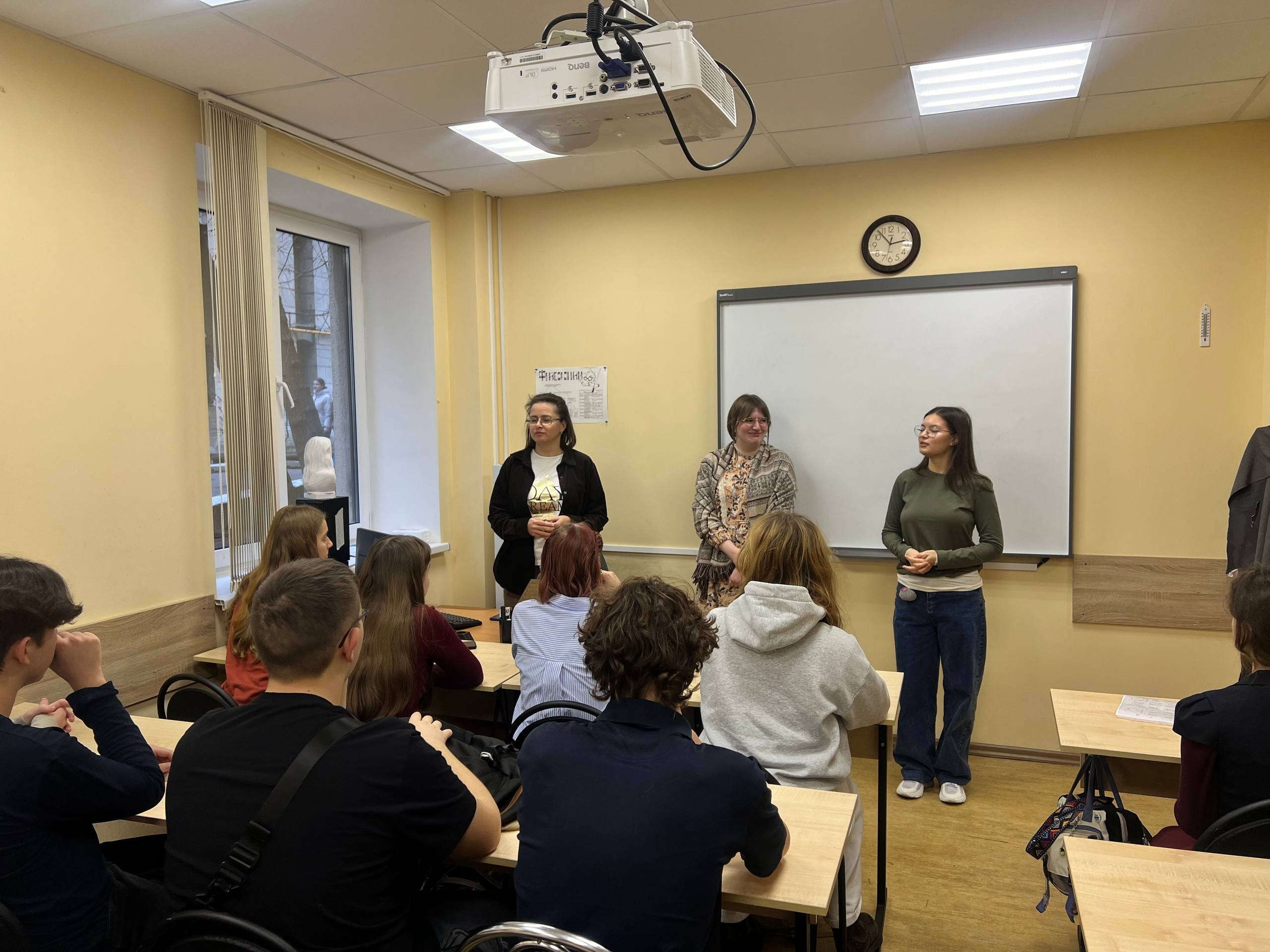 В рамках Недели русского языка для учеников 10-х классов прошла профориентационная встреча, которую провели старший преподаватель кафедры русского языка Института филологии и истории РГГУ Дарья Владимировна Якунина, выпускница Предуниверсария 2021 года Савенкова Валерия и преподаватель русского языка Елизавета Олеговна Албей.